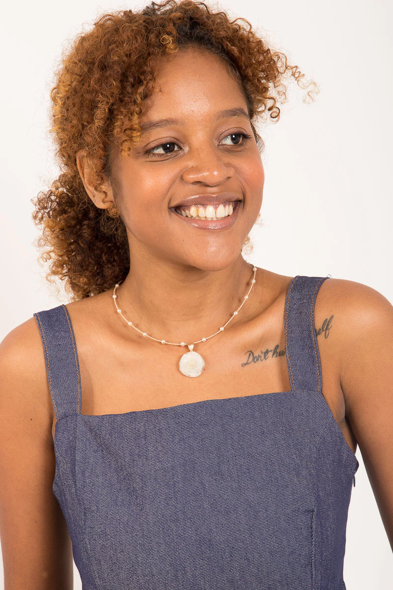 O Colar Escama Canapú é uma peça leve e delicada, pensada para quem gosta de acessórios discretos. Seu pingente em formato de flor — feito a partir do reaproveitamento de escamas de peixe — reflete o trabalho artesanal de Dona Cleide, com cada pétala moldada à mão em um trabalho cuidadoso e minucioso.